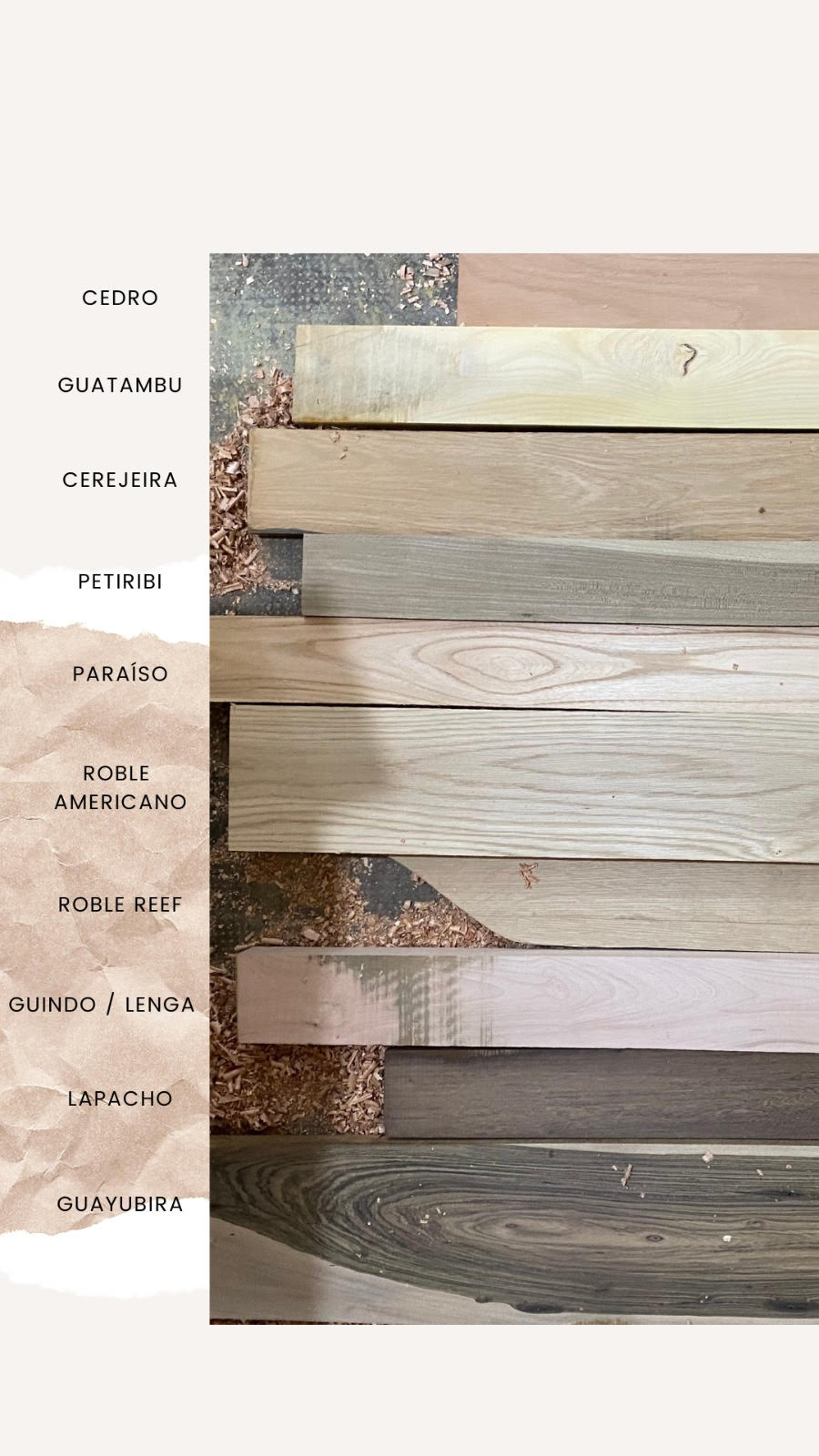 Trabajamos una amplia variedad de maderas. Acá te mostramos las más pedidas para que veas los diferentes tonos y vetas. Todos nuestros muebles están protegidos con laca poliuretánica transparente semi mate.